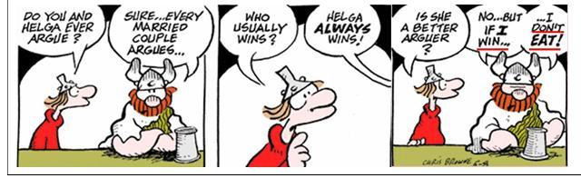 c) Hagar enfatiza que Helga sempre ganha a discussão porque isso é necessário para que ele possa comer.