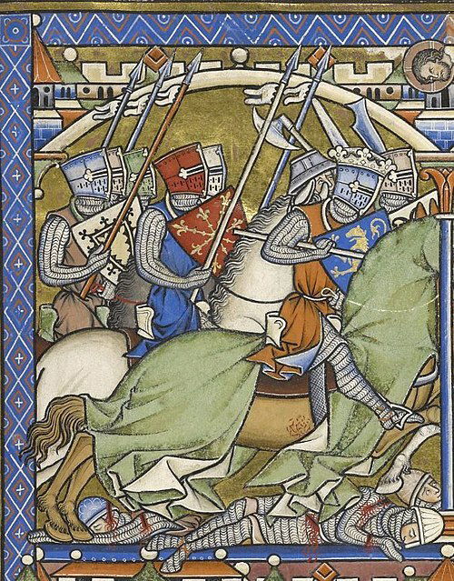 c) A imagem apresenta um grupo de soldados muçulmanos derrotando os soldados cruzados, caídos ao chão. É possível chegar a essa conclusão pelos símbolos dos escudos e estandartes.