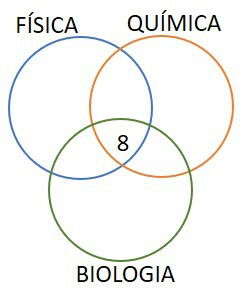 O próximo passo é preencher as intersecções secundárias. Como 32 estudam Biologia e Física e, na área de intersecção entre estas faculdades já temos 8, restam 32 - 8 = 24. Seguindo este raciocínio, para química e biologia temos 16 - 8 = 8 e para Física e Química temos 23 - 8 = 15.
