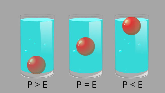 - Se a força do empuxo (E) tiver maior intensidade que a força peso (P), o corpo subirá para a superfície;