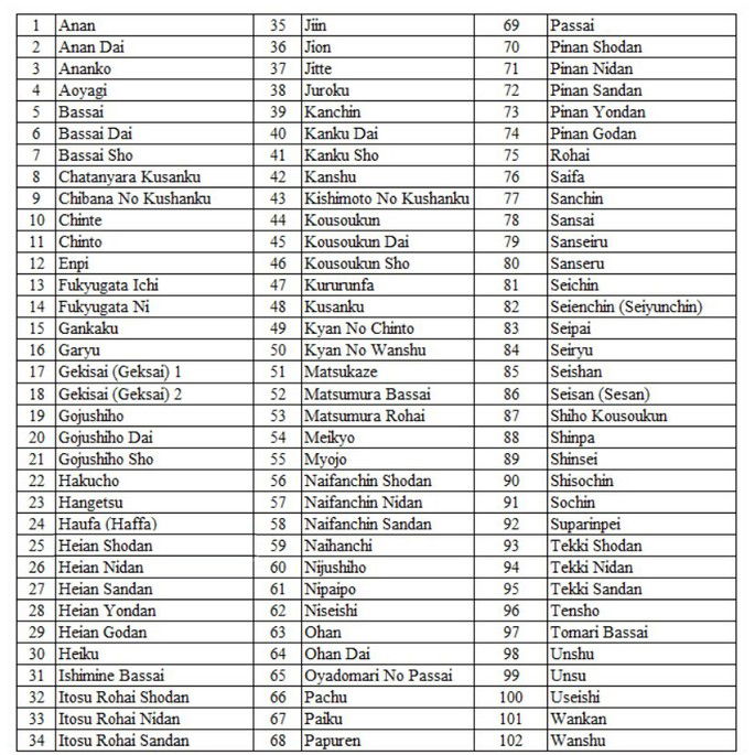 Existem competições de kata individuais e em equipes compostas por três atletas homens ou por três atletas mulheres. Nestas competições, os atletas devem apresentar um dos katas da lista abaixo em cada rodada e devem ser diferentes em cada uma delas, ou seja, sem repetições.