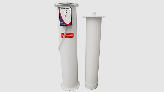Esse equipamento é composto por uma coluna de troca iônica preenchida com resinas catiônica e aniônica. Essas resinas liberam íons H+ e OH- enquanto que os íons presentes na água são fixados na coluna.