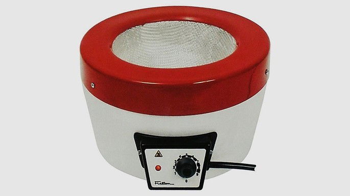 O material no interior do balão de fundo redondo é aquecido geralmente quando o recipiente é inserido em uma manta de aquecimento.