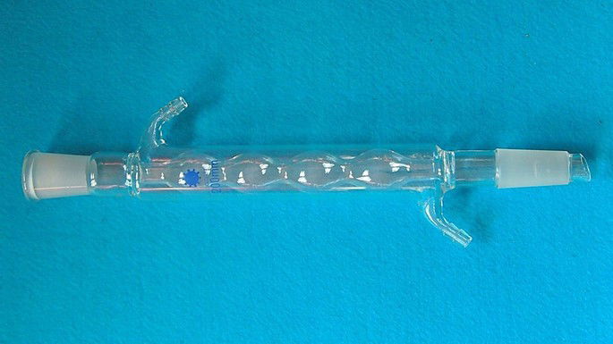 Quando o vapor passa pelo condensador, ocorre a troca de calor com a água fria que circula pelas paredes da vidraria e assim o material é condensado.