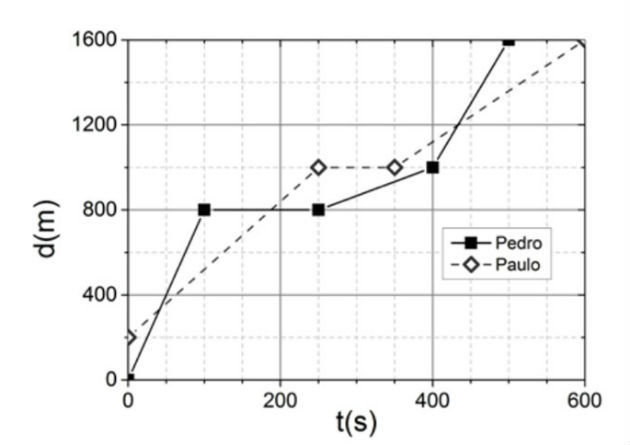 (UFRGS - 2016) Pedro e Paulo diariamente usam bicicletas para ir ao colégio. O gráfico abaixo mostra como ambos percorreram as distâncias até o colégio, em função do tempo, em certo dia.