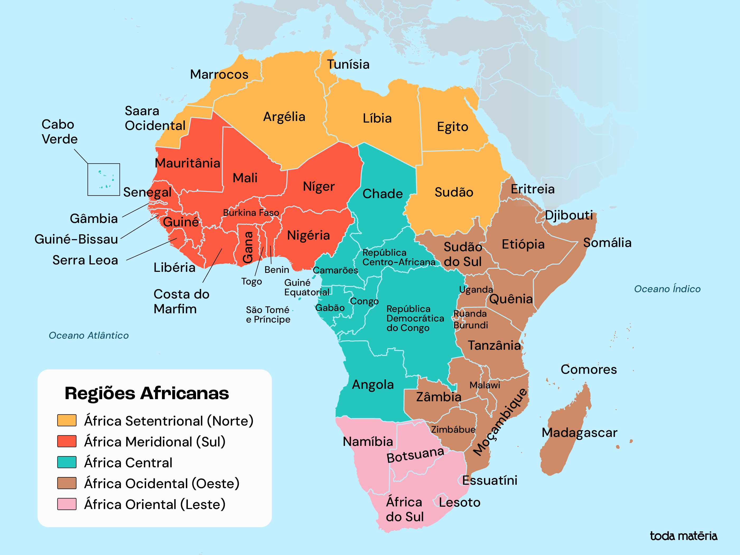 BEZERRA, Juliana. Países da África: mapa, capitais, áreas, idiomas e moedas. Toda Matéria, [s.d.]. Disponível em: https://www.todamateria.com.br/paises-da-africa/. Acesso em: