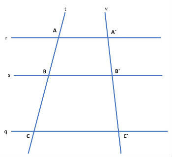 Os pontos A, A´, B, B´, C, C´ foram obtidos pelo cruzamento das retas paralelas r, s e q com as retas transversais t e v.