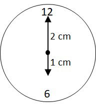 d) O vetor tem módulo 2 cm e aponta na direção do número 6 do relógio.