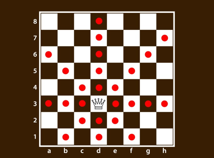 A rainha (ou dama) pode se movimentar quantas casas quiser e em qualquer direção (na diagonal, na horizontal ou na vertical), mas não pode saltar sobre nenhuma peça, a não ser que fique no lugar de uma do outro jogador, ou seja, que a coma.